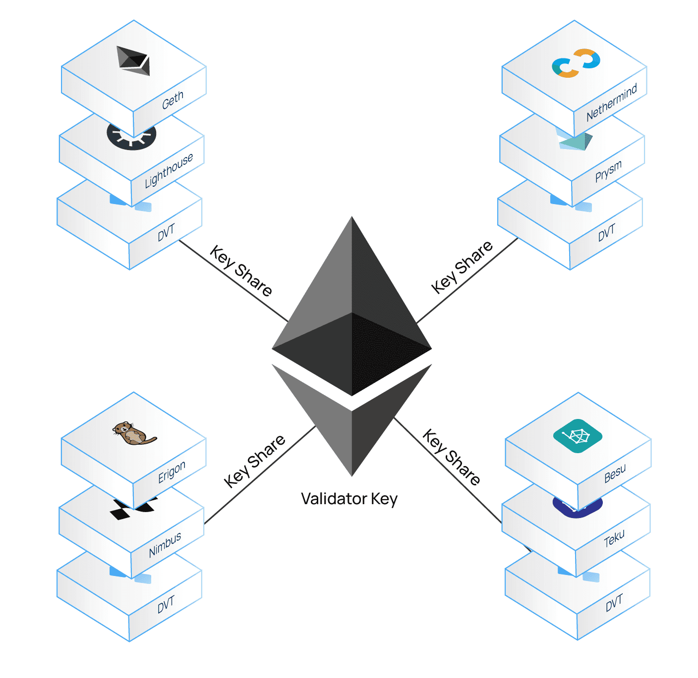 - Multiparty Computation (MPC): The full validator key is secretly generated using MPC. No individual operator knows the full key—only their specific portion of it.