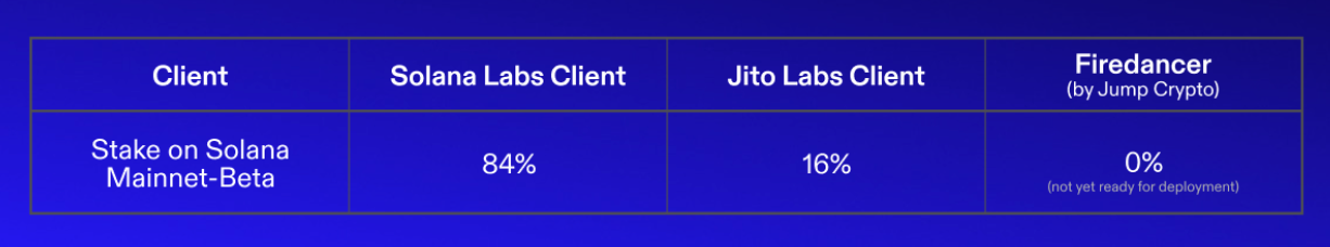 According to the March 2023 Validator Health Report published by the Solana Foundation, around 84% of stakes are run through the Solana Labs client. The Jito Labs software client accounts for the other 16%. When Firedancer launches, the diversity will hopefully increase even more.